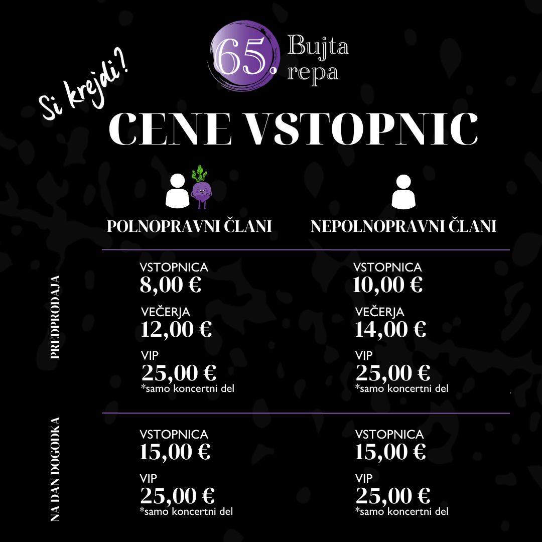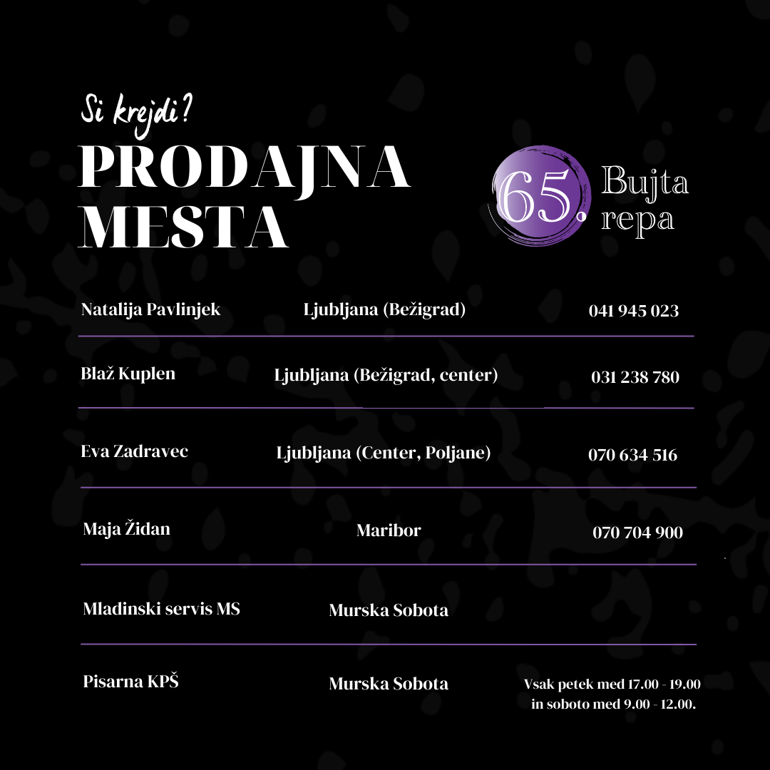 Prodajna mesta | 65. Bujta repa 20. Feb 2023Tudi letos si lahko priskrbite svojo vstopnico na prodajnih mestih v Ljubljani, Mariboru in Murski Soboti. Za nakup kart kontaktirajte naše prodajalce ali se osebno oglasite na Mladinskem servisu v Murski Soboti vsak delavnik med 7:30 in 15:30.